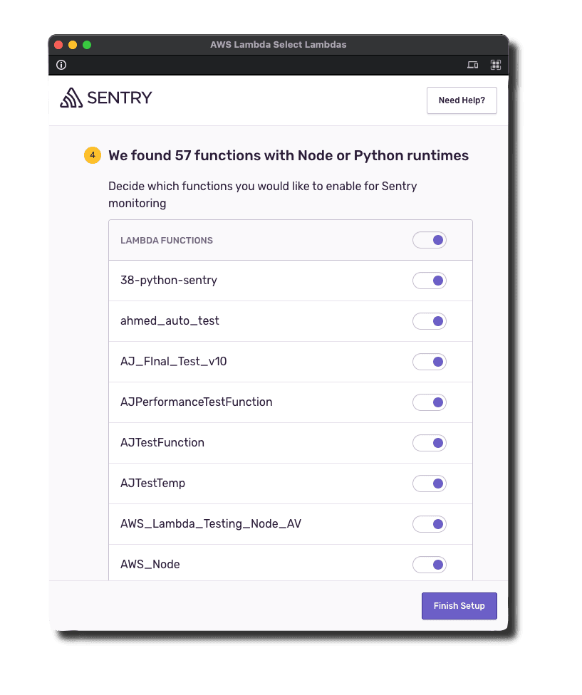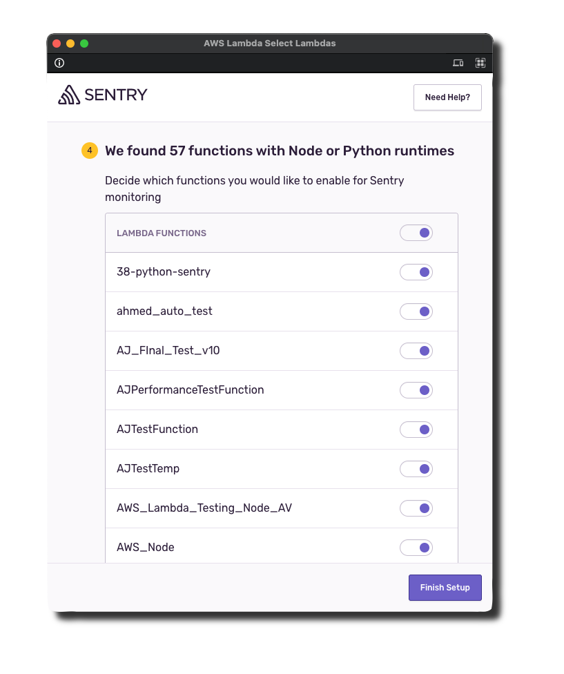 Select the Lambda functions to automatically add the Sentry layer and necessary environment variables when you Finish Setup. Note: You can enable or disable Sentry on Lambda functions after installation.