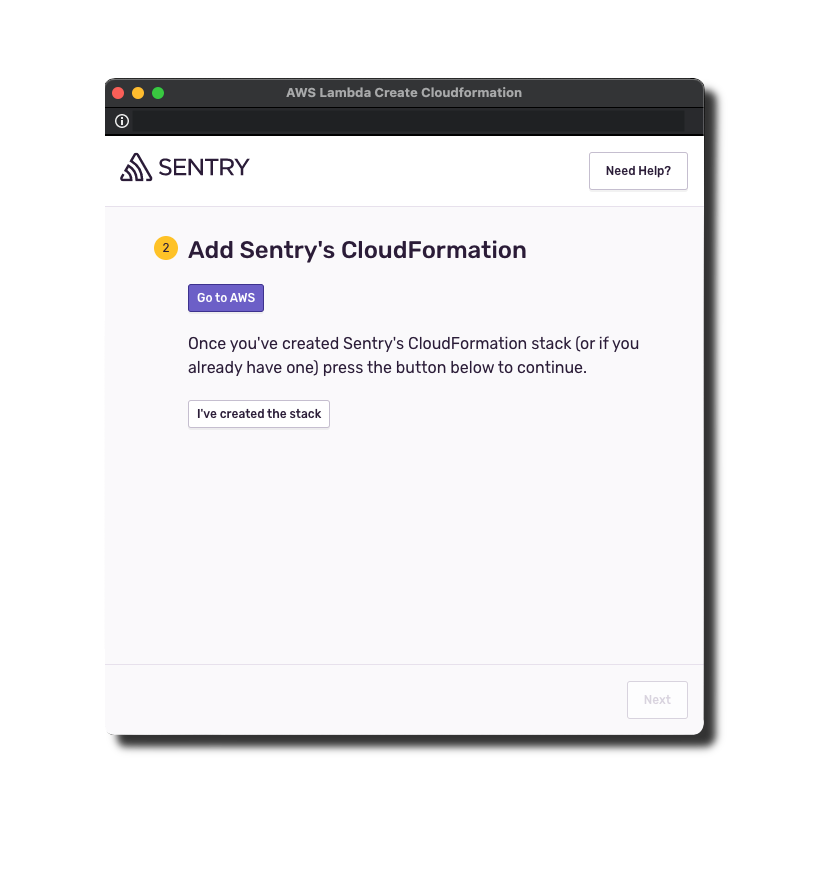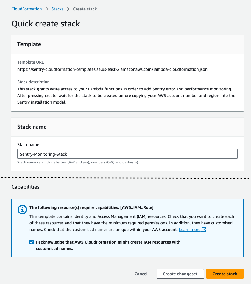 Scroll to the bottom of the Create Stack page, check the box, then press Create Stack to create a CloudFormation stack in your current region. This stack allows Sentry to automatically instrument your Lambda functions.