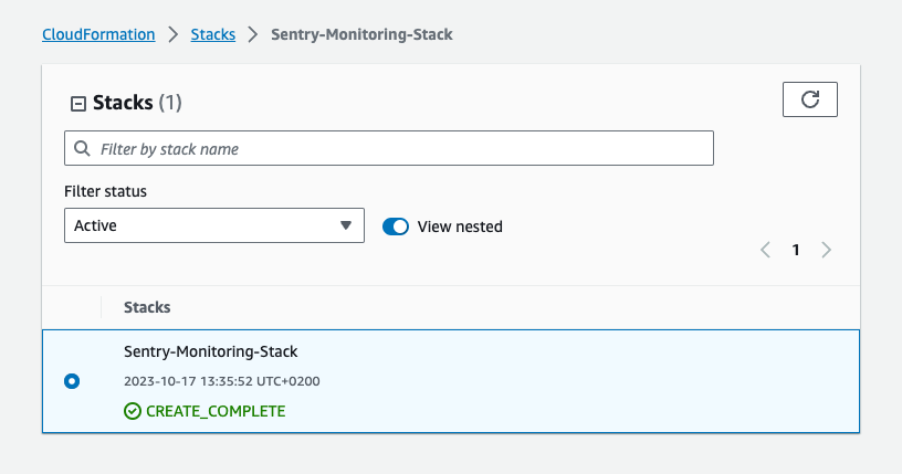 Wait for the stack to be created. Once it's confirmed and the status changes to Create Complete, click I've created the stack in the Sentry popup.