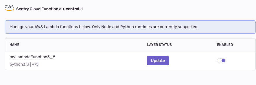 The integration configuration view in Sentry allows you to do the following with your Lambda functions: