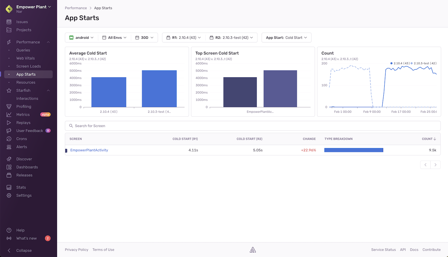 - The overall time it takes your application to start, compared by release.