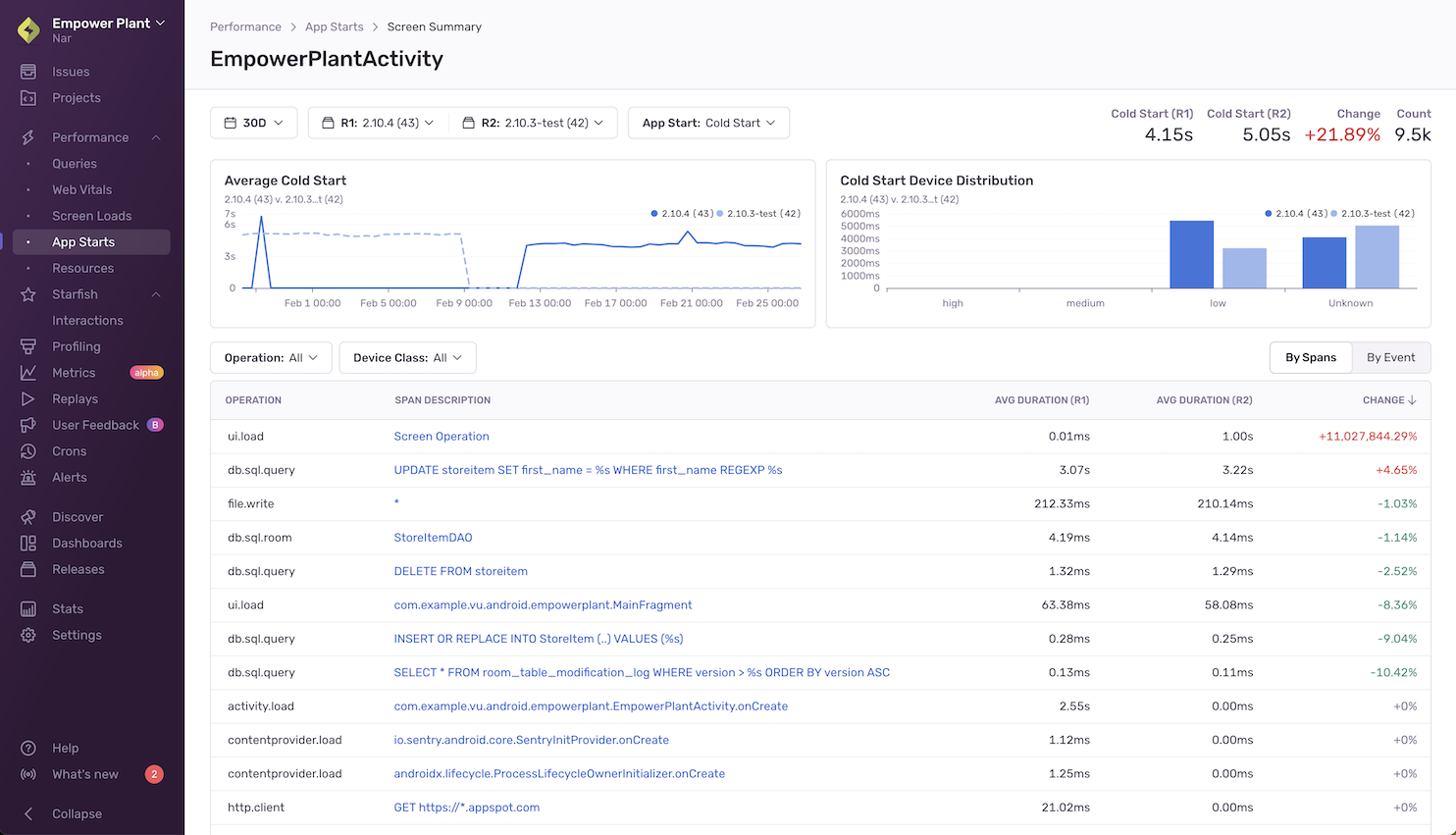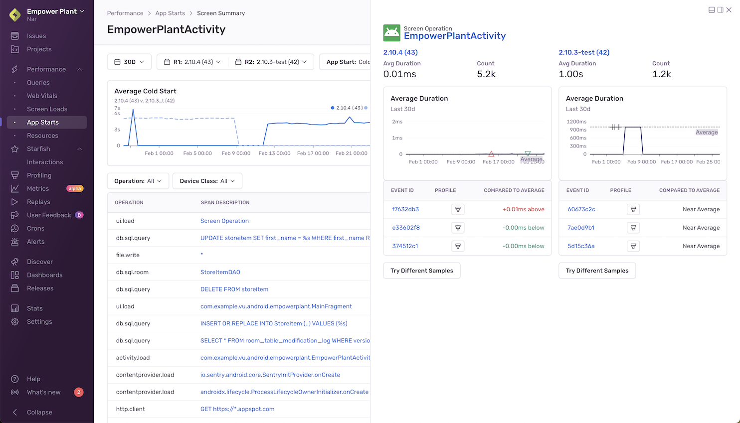 The table below the chart shows spans that have changed from one release to the next and allows you to filter for specific span operations and device classes. Being able to narrow down to specific event samples helps debug slow starts.